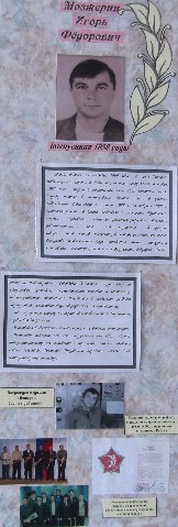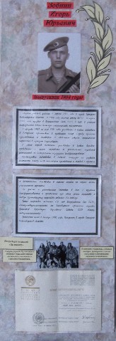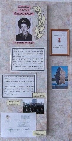 В экспозицию включены материалы о выпускниках школы №9, прошедших Афганистан. Представлены документы в подлинниках и копиях, сведения о наградах. Данная экспозиция заняла II место в районном смотре-конкурсе в рамках месячника патриотического воспитания.