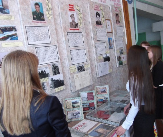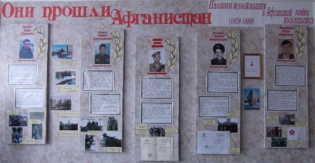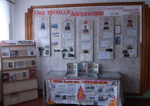 Музейная экспозиция в школьном зале боевой славы, посвящённая 25-летию вывода советских войск из Афганистана.